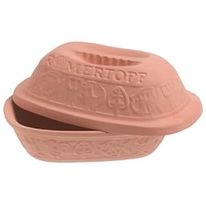 For centuries food has been cooked in earthenware pots over open fires or in brick ovens. Römertopf carries on this tradition by crafting clay pots and dishes specifically intended for cooking a variety of vegetables, meats, casseroles, and breads in the home oven. Manufactured in Mexico, each vessel is made from unglazed and porous terra cotta containing no lead or cadmium. Before each use, the pot is soaked in water in order to absorb a certain amount of moisture into the permeable clay. This moisture is slowly released during cooking, sealing in the natural juices and increasing the flavor and tenderness. Covered in a bounty of sculpted agricultural motifs, and with a built-in handle, the Römertopf 1/2-quart baker can be used to prepare a small chicken, a meat and vegetable stew, or a casserole for a family of four. Measuring 7-1/2 by 11 inches and standing 6 inches tall, the baker can go straight from the oven to the table and can be used as a serving dish. Intended to be used only in the oven, Römertopf recommends washing all clay pots by hand. Due to their porous and unglazed nature, the pots should not be exposed to extreme temperature changes. --Lea Werbel